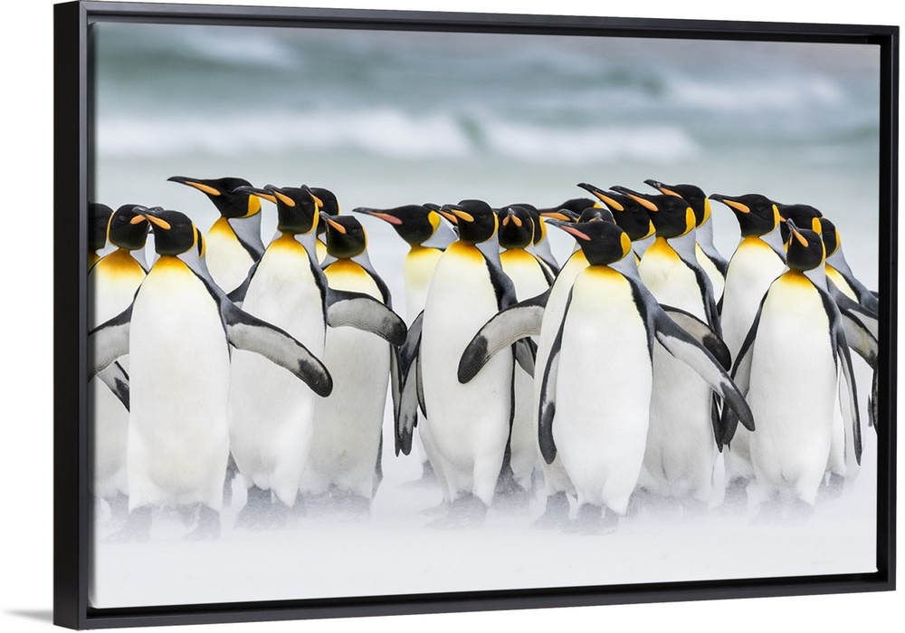 <p>King Penguin (Aptenodytes patagonicus) on the Falkand Islands in the South Atlantic. Group of penguins marching on sandy beach towards their colony. South America, Falkland Islands, January</p>