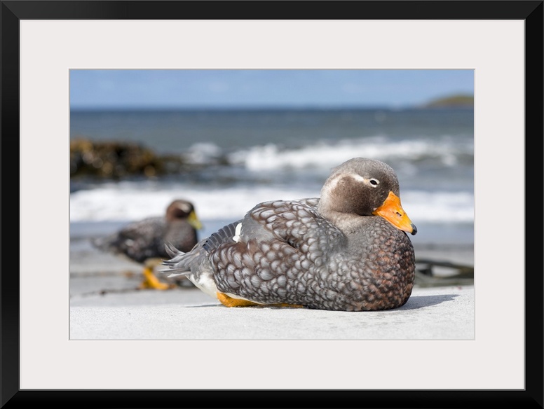 <p>Falkland flightless steamer duck (Tachyeres brachypterus), a flightless duck endemic to the Falkland Islands. Male shows an orange, female a greenish beak. South America, Falkland Islands, January.</p>