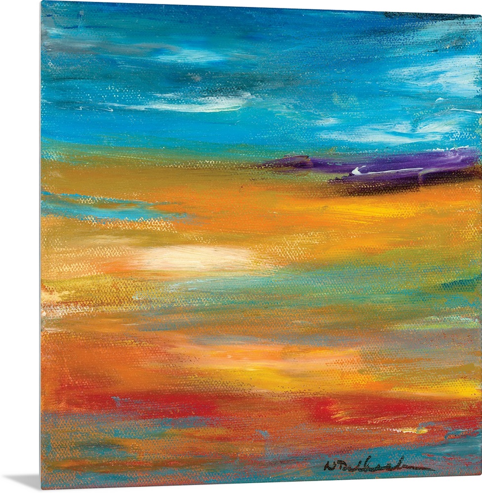 <p>Square abstract painting with layered horizontal brushstrokes in shades of orange, yellow, red, blue, and purple resembling a Fall landscape.</p>