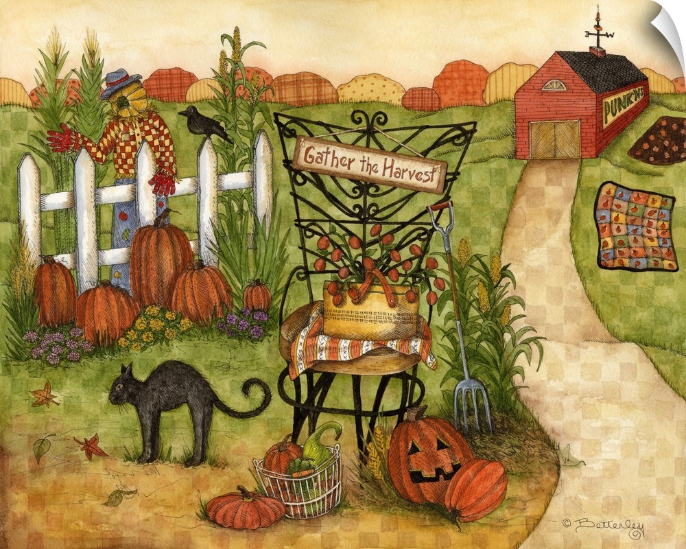 <p>Barn with path leading to fence with scarecrow, crow, cat, pumpkins, corn, chair and sign that reads: Gather the Harvest.</p>