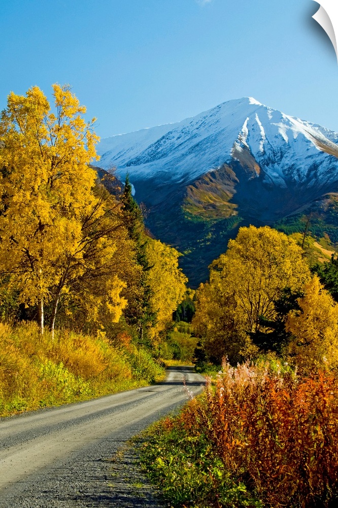 <p>Fall colors and snowcapped peaks on the Palmer Creek Road near Hope in the Chugach National Forest on the Kenai Peninsula in southcentral Alaska.</p>