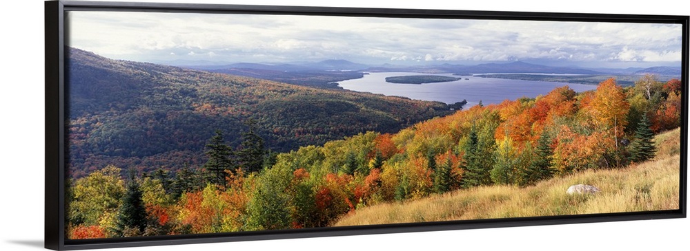 <p>Wide angle photograph overlooking autumn colored trees on a hillside, dense forest surrounds Mooselookmeguntic Lake in the distance, beneath a partly cloudy sky in Maine.</p>