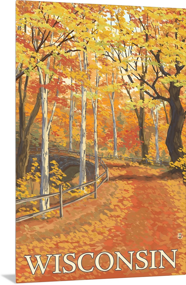 <p>A stylized art poster of a road through an autumn forest that passes over a stone arch bridge.</p>
