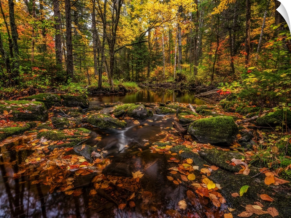 <p>Fall colours along a remote stream in rural Ontario, Algonquin Provincial Park; Ontario, Canada.</p>