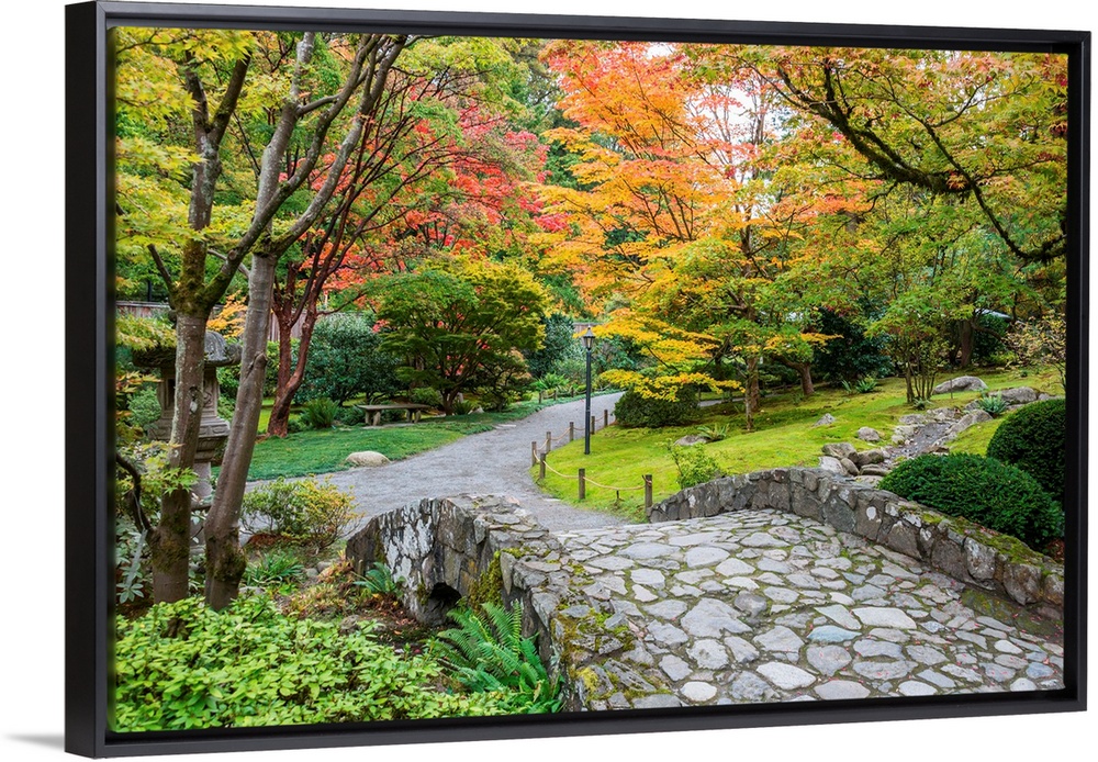 <p>Autumn colors along a winding walking path and stone bridge in a Japanese garden.</p>
