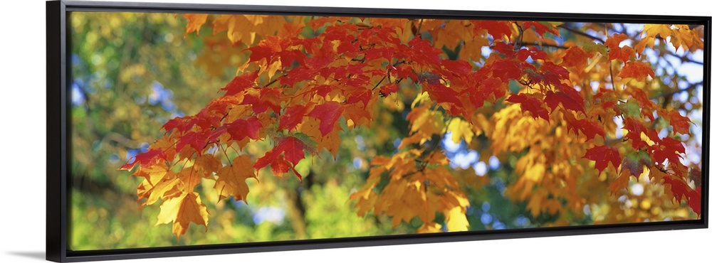 <p>A panoramic photograph of a branch of autumn leaves consisting of several colors.</p>
