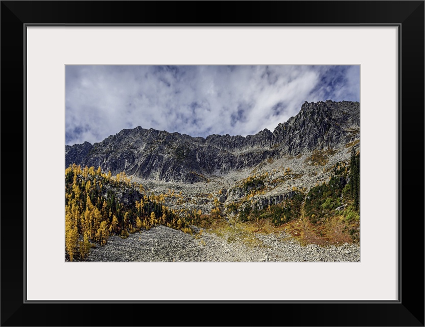 <p>Craggy mountains, with golden larches and dark green sub-alpine fir trees in fall.</p>
