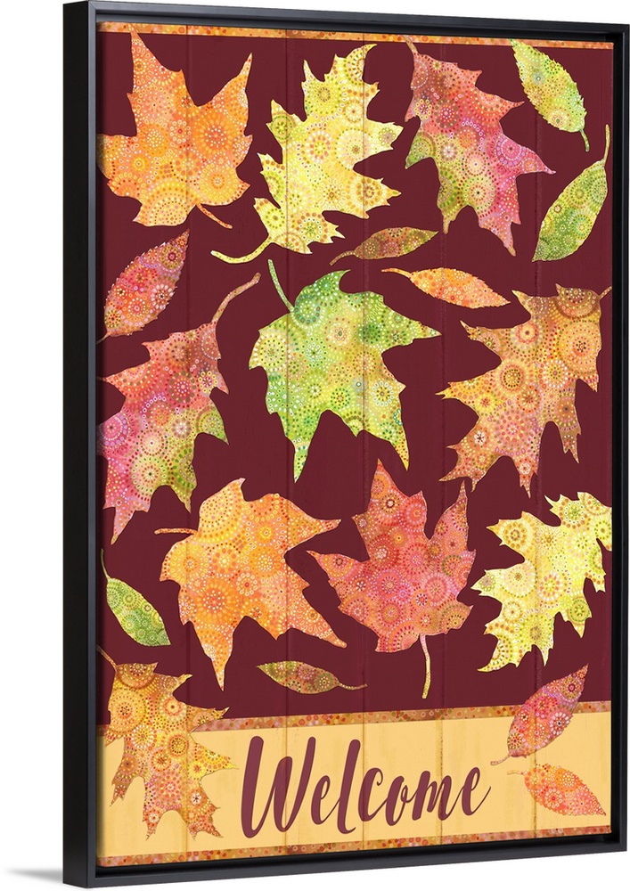 <p>Welcome fall with colorful patterned leaves on rich maroon painted board background.</p>