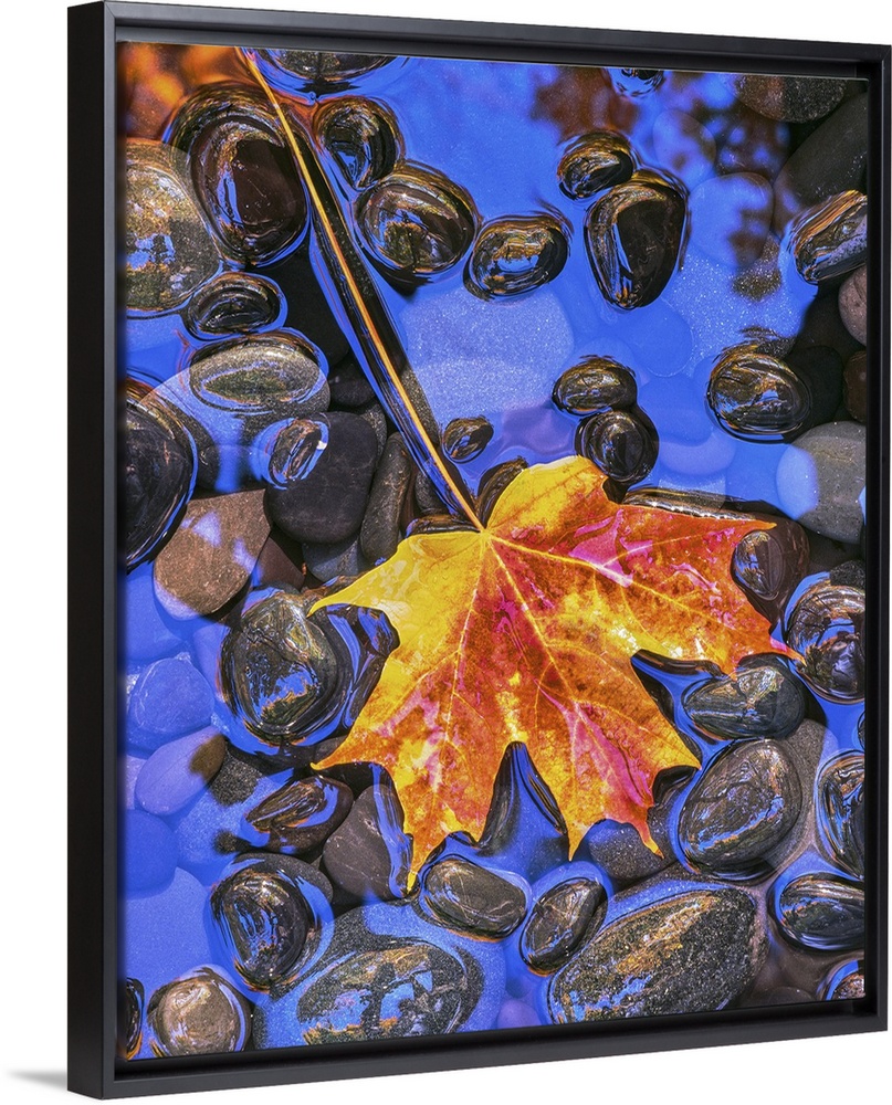 <p>Fall leaves on black rocks in water</p>