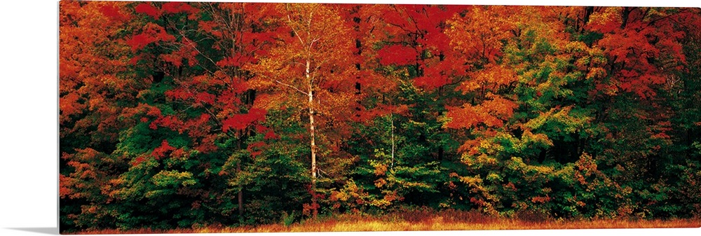 <p>Panoramic photograph of dense forest filled with trees covered in autumn leaves.</p>