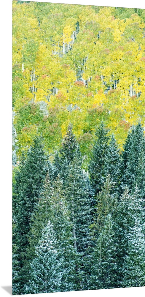 <p>Landscape photograph of snow covered pine tree tops in Autumn.</p>