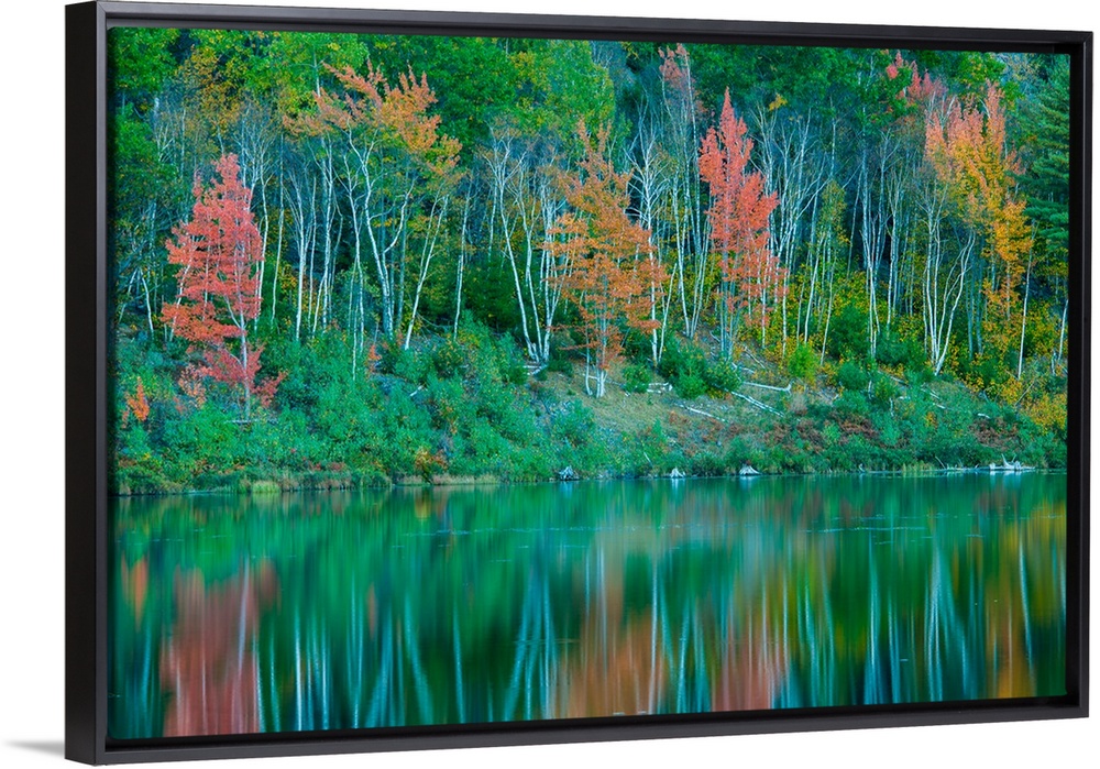 <p>A verdant forest with some fall colors reflected in the pond below, Acadia National Park, Maine.</p>
