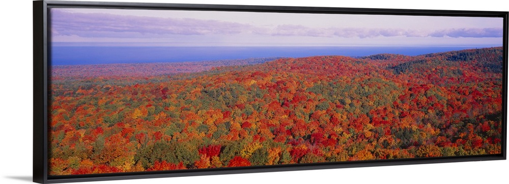 <p>Deciduous forest showing wide array of autumn colors across the hills of Michigan, with a lake in the background.</p>