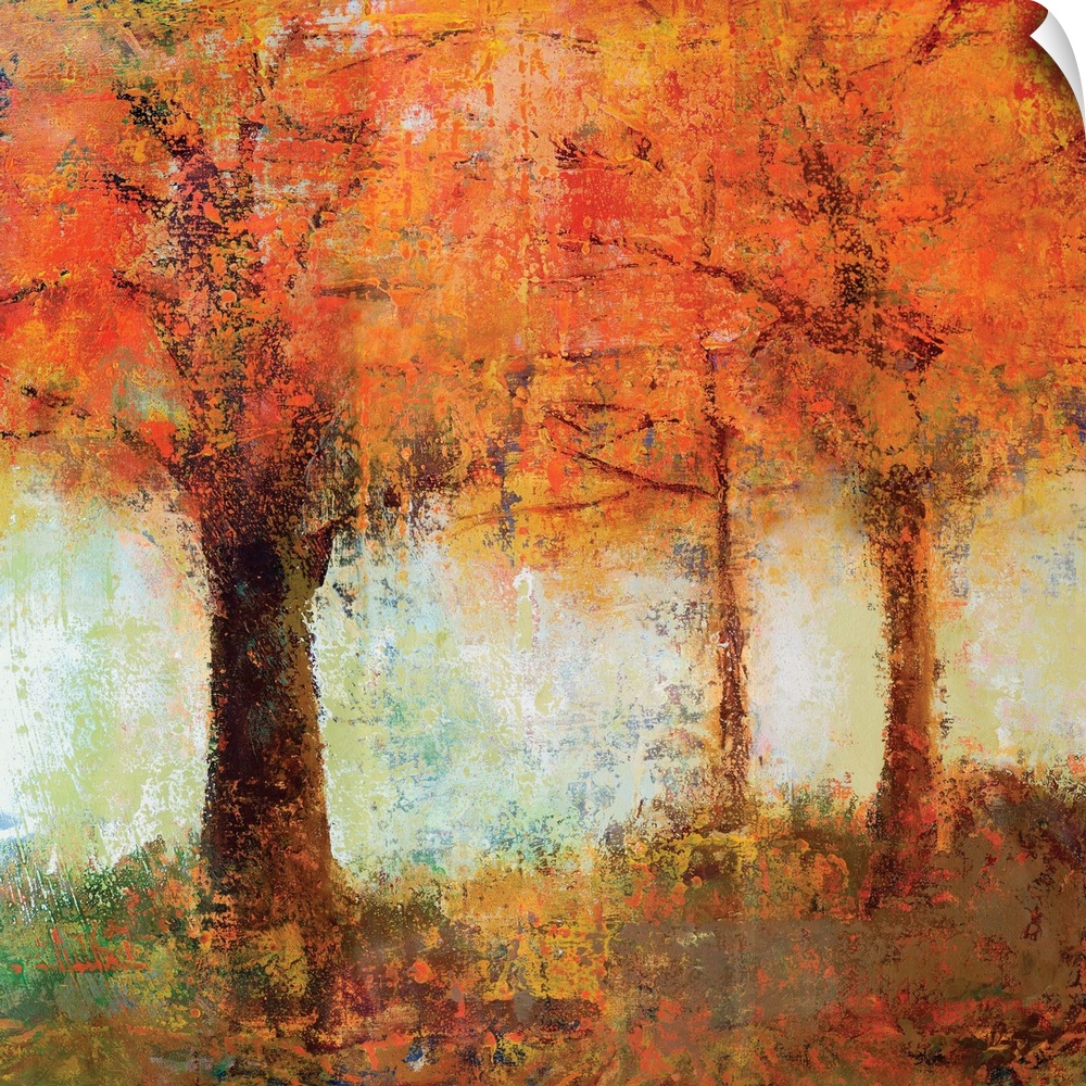 <p>Contemporary artwork of brightly colored fall trees against a soft pale green sky.</p>