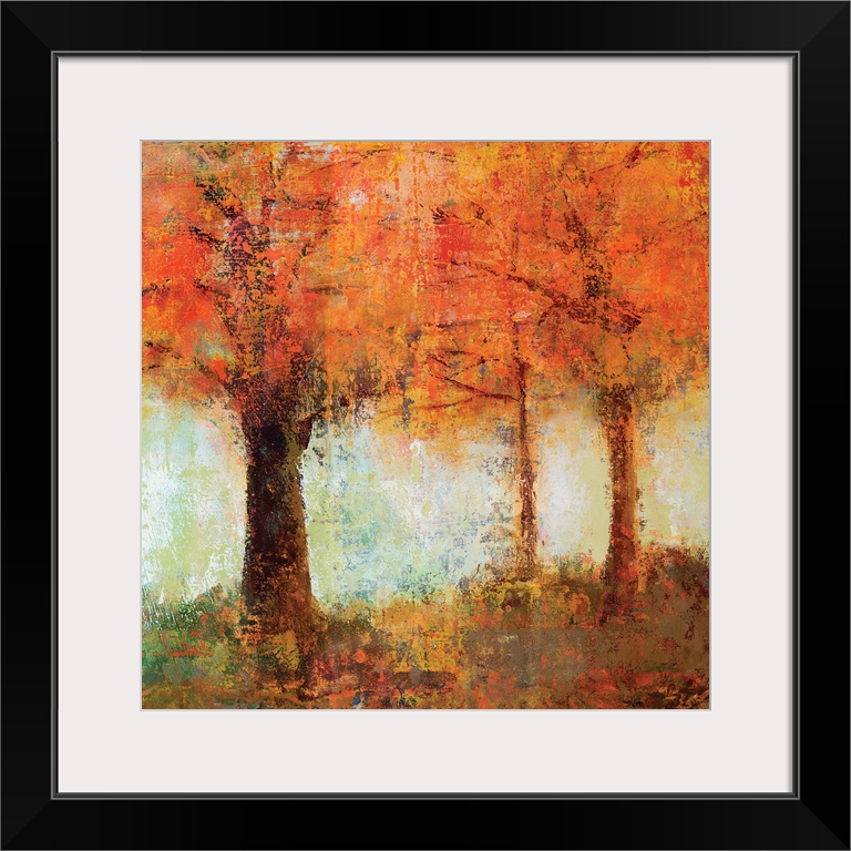 <p>Contemporary artwork of brightly colored fall trees against a soft pale green sky.</p>