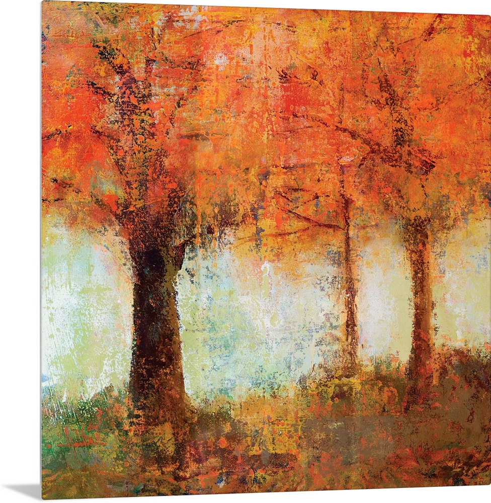 <p>Contemporary artwork of brightly colored fall trees against a soft pale green sky.</p>