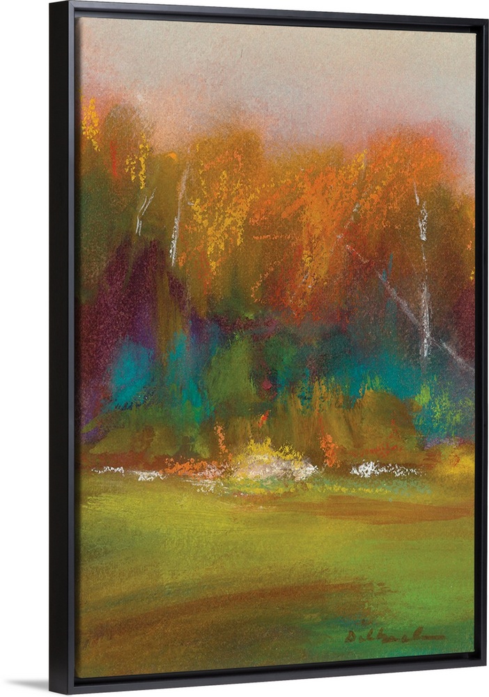 <p>Abstract Autumn landscape painting with green, yellow, orange, purple, and blue hues.</p>