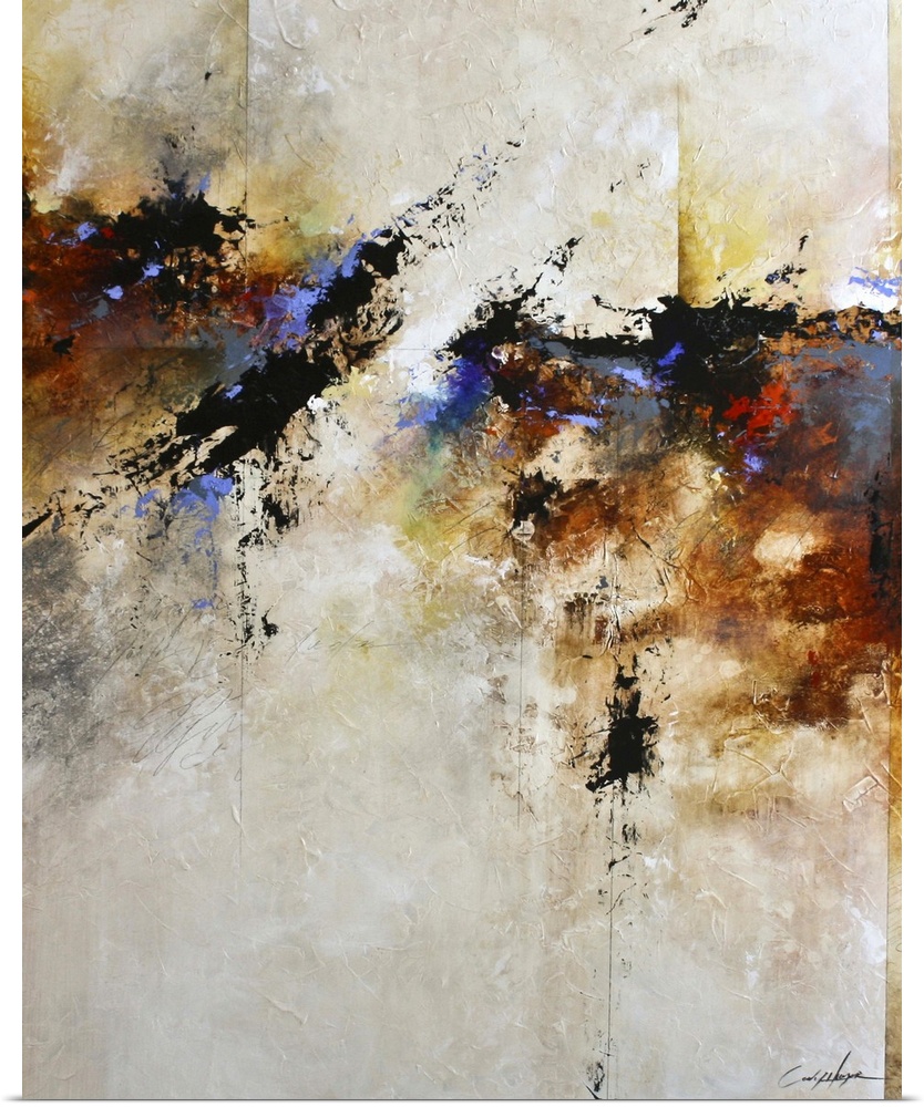 <p>Contemporary abstract painting in beige, blue, black, and amber.</p>