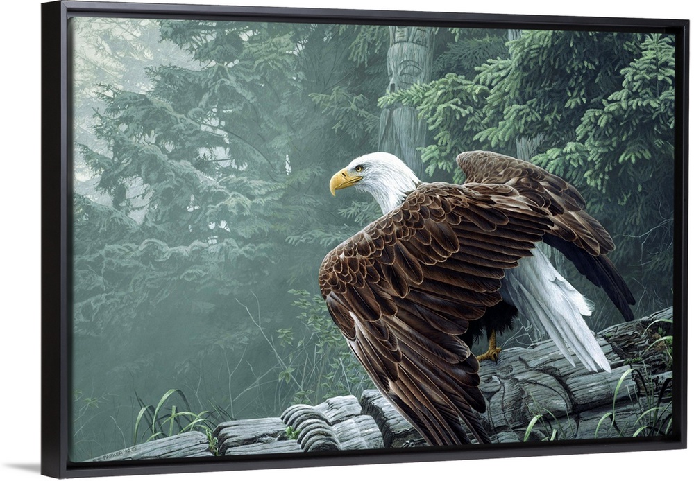 <p>An eagle perched on a totem pole that has fallen over.</p>