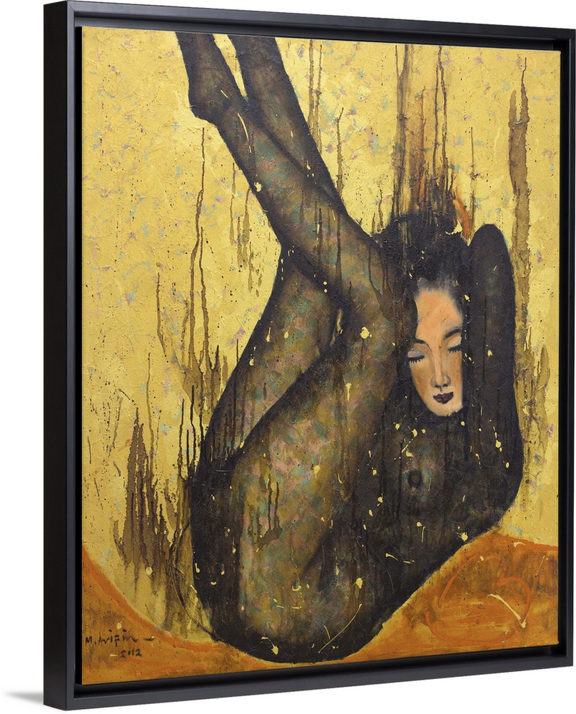 <p>Muhammad Arifin depicts a beautiful nude falling into a golden pool, combining warm oil colors on canvas to summon the words Falling in Love. She is falling in love, drowning in the depths of love, which is tempting, the artist explains. Even she is now forgetting about herself as if she were falling into the unreachable deepness of the ocean.</p>