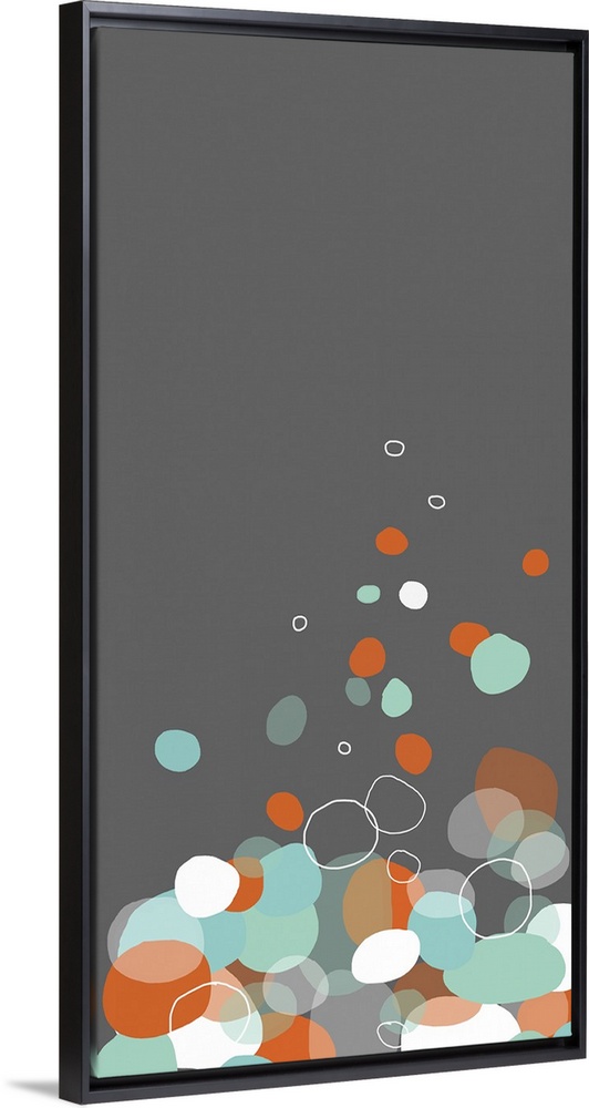 <p>Large, vertical contemporary art of various circular shapes on a solid background. The shapes resemble rocks that are falling downward into a pile at the bottom of the image.</p>