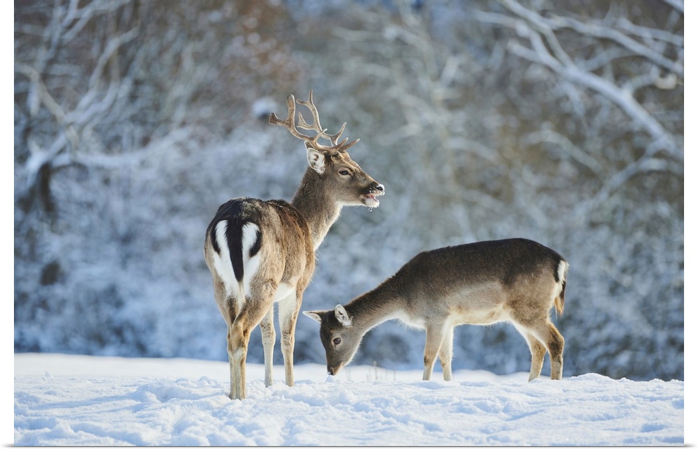 <p>Fallow deer (Dama dama) on a snowy meadow, Bavaria, Germany</p>