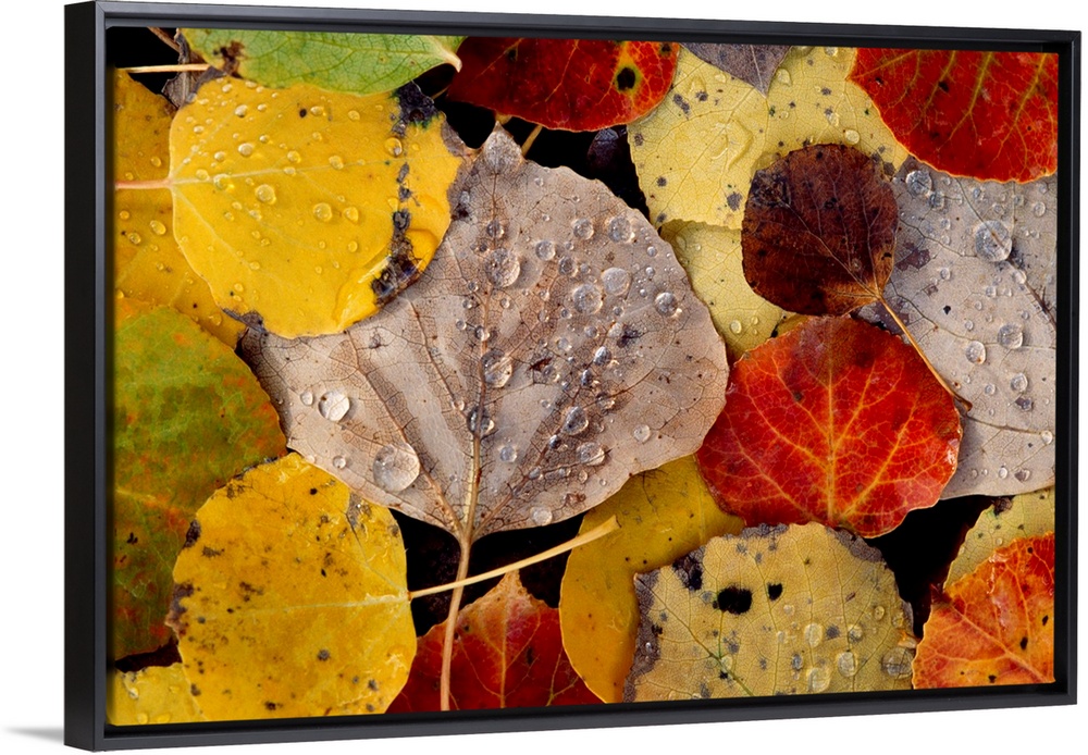 <p>Landscape fine art photograph of a pile of fall leaves covered in dew drops.</p>