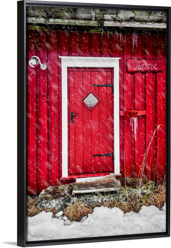 <p>Door of a red chalet in Norway, also called rorbu</p>