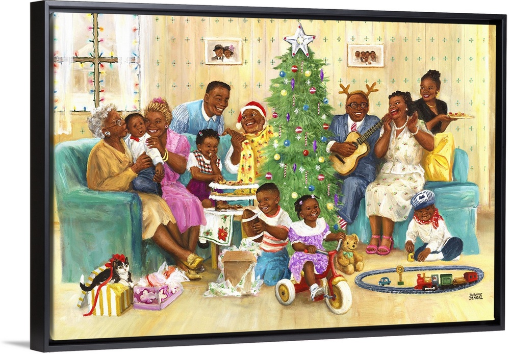 <p>An African American family celebrating Christmas morning around a tree with toys and music.</p>