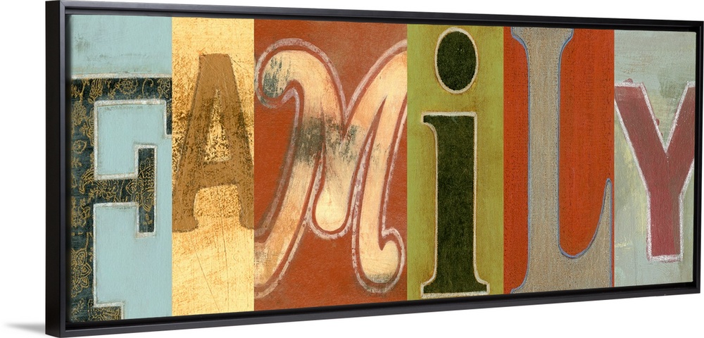 <p>Giant, horizontal wall hanging of the word "Family", each letter in a different font and on a different rectangle of color.</p>