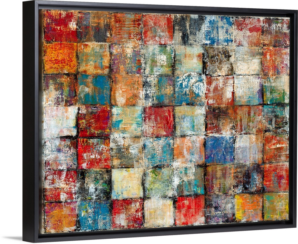 <p>Contemporary abstract painting of distressed multicolored squares lined up in a grid pattern.</p>