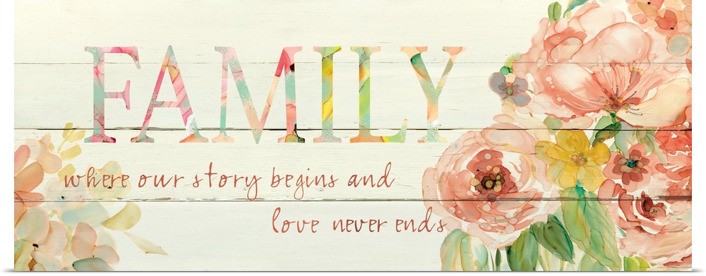 <p>"Family Where Our Story Begins and Love Never Ends" written on a faux wood panel background with painted pink flowers on the sides.</p>
