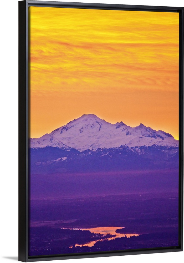 <p>Famous Mt.Baker volcano, located in North Cascade Mountain Range dominates background while early morning sunlight reflected off of mighty Fraser River.</p>