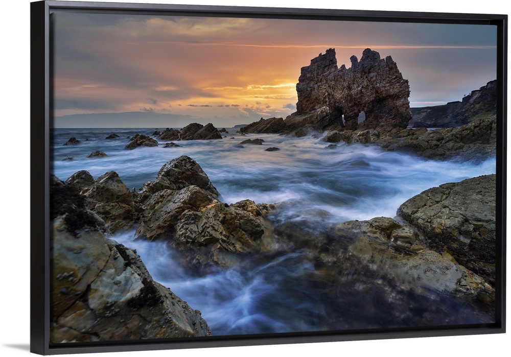 <p>Famous rock at Portizuelo beach at sunrise, Valdes, Luarca, Asturias, Spain</p>