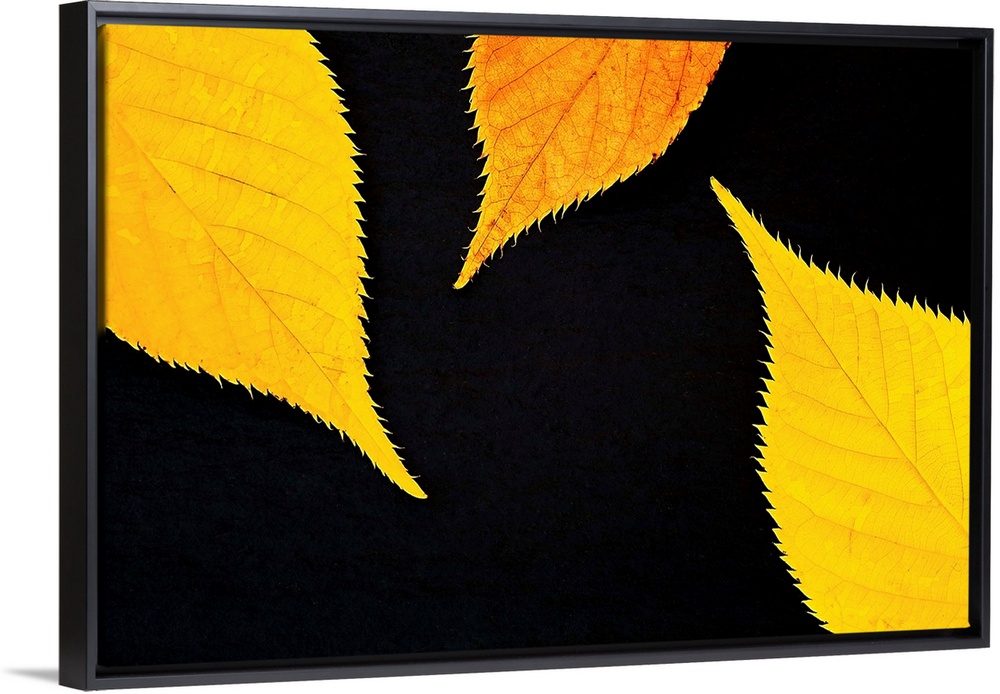 <p>Three golden yellow leaves close-up on a black background.</p>