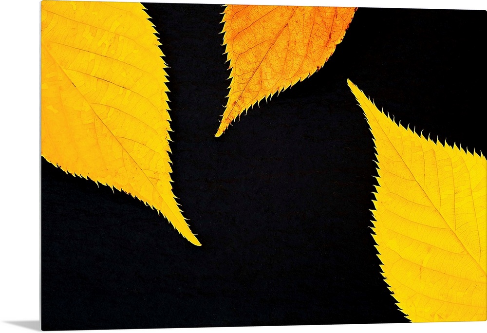 <p>Three golden yellow leaves close-up on a black background.</p>