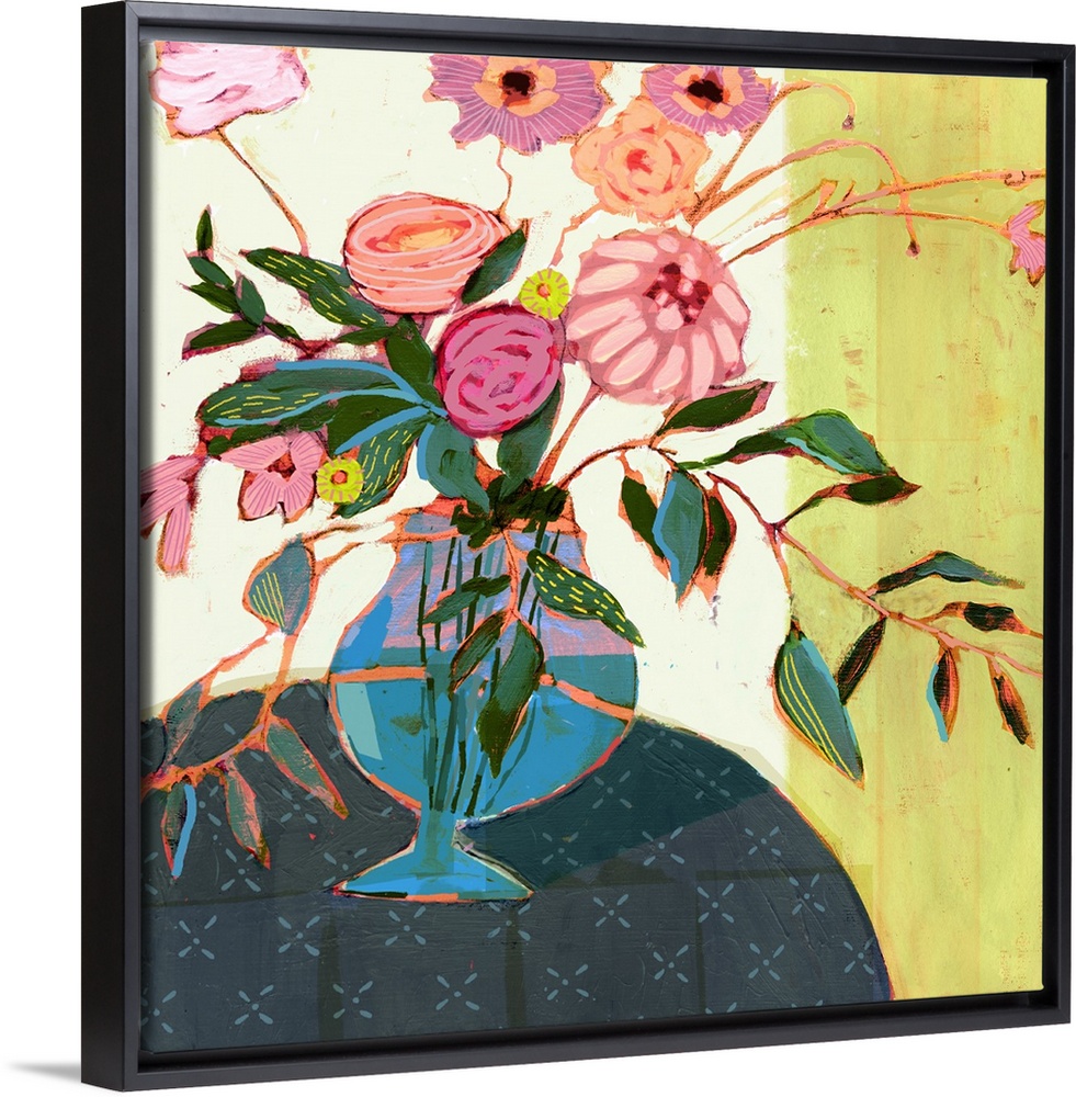 <p>This whimsical artwork features dazzling flowers arranged energetically in a blue vase over a patterned dark blue tablecloth.</p>