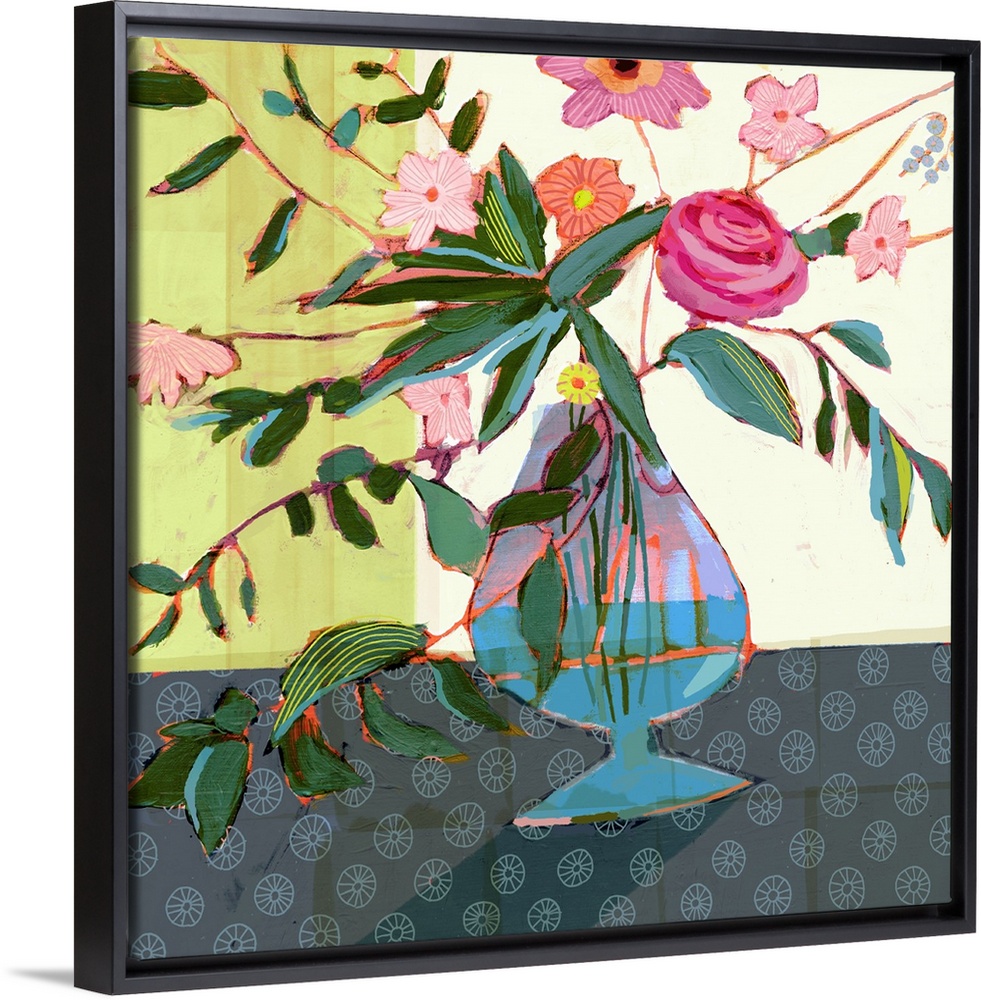 <p>This whimsical artwork features dazzling flowers arranged energetically in a blue vase over a patterned dark blue tablecloth.</p>