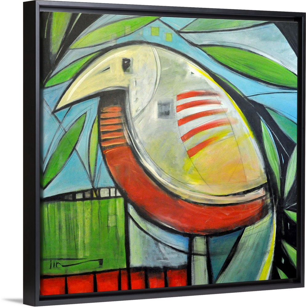 <p>Square, giant abstract painting of a colorful bird surrounded by leaves. The entire image is composed of basic shapes.</p>