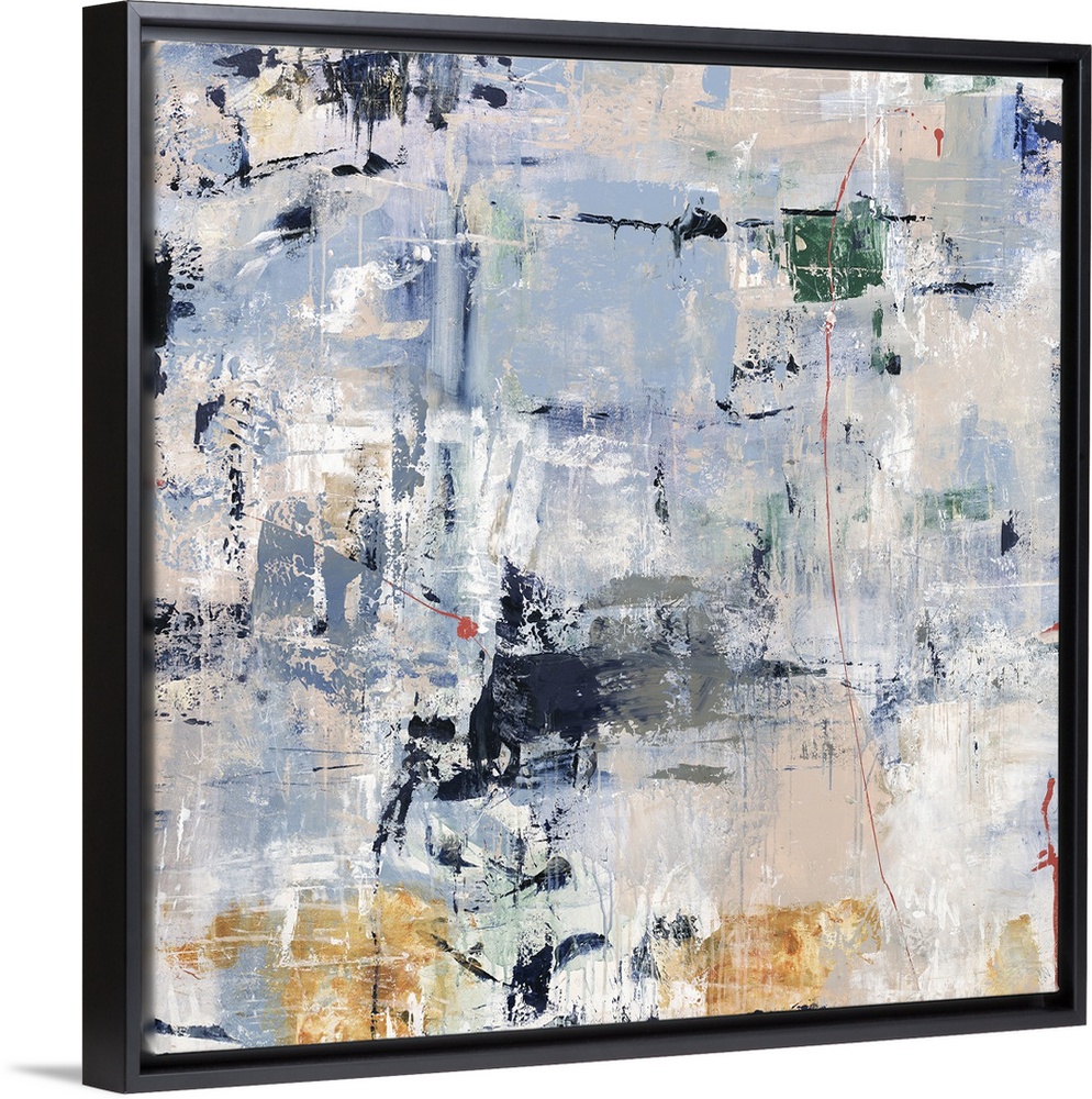 <p>Square abstract artwork in shades of blue with pops of emerald green, coral, gray, and gold.</p>
