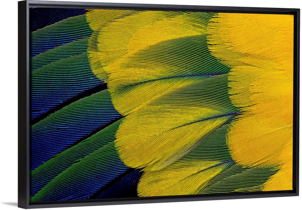 <p>Fanned out wing feathers in blue, green and yellow of Sun Conure photographed Sammamish, WA</p>
