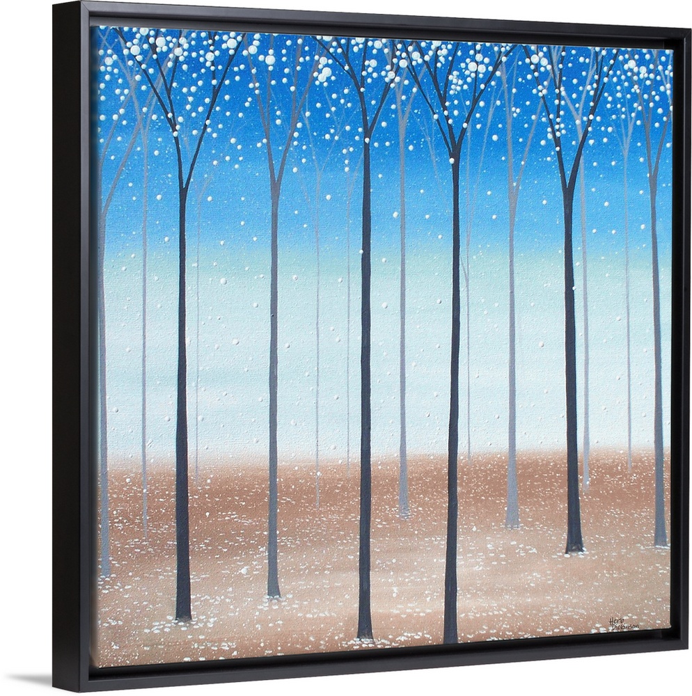 <p>Square minimalist painting of tall, skinny trees with white blossoms falling to the ground.</p>