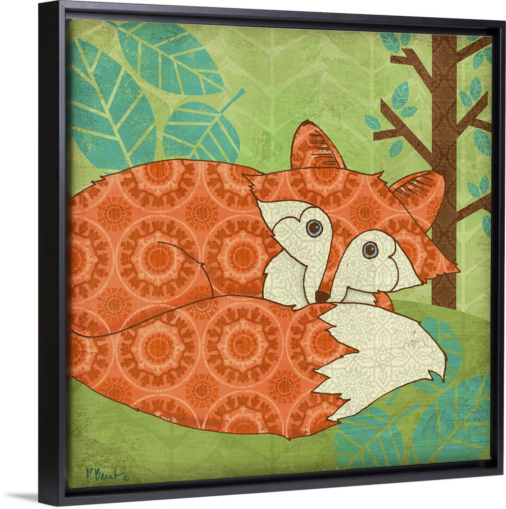 <p>Cute, decorative artwork of a little fox in the woods made with retro patterns.</p>