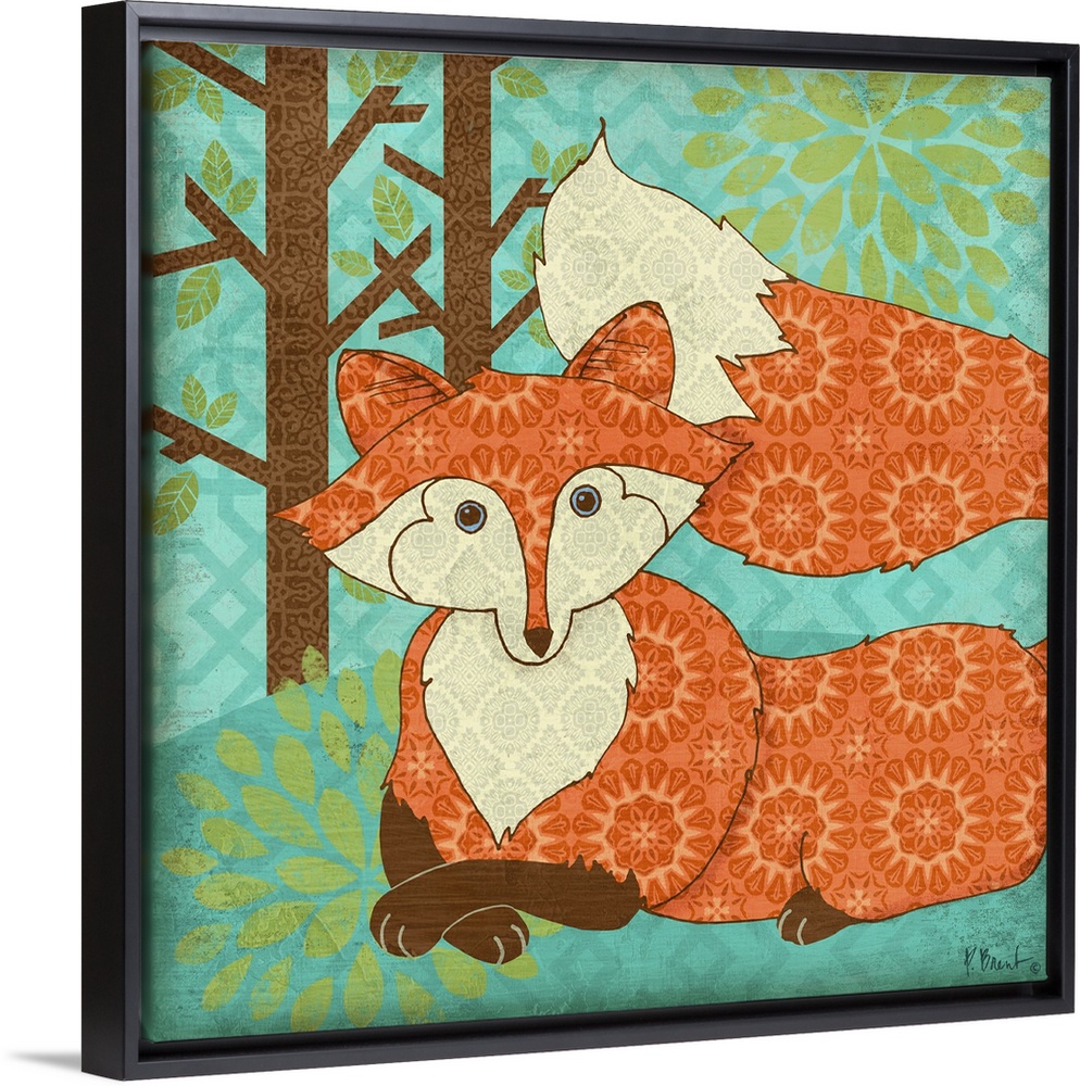 <p>Cute, decorative artwork of a little fox in the woods made with retro patterns.</p>
