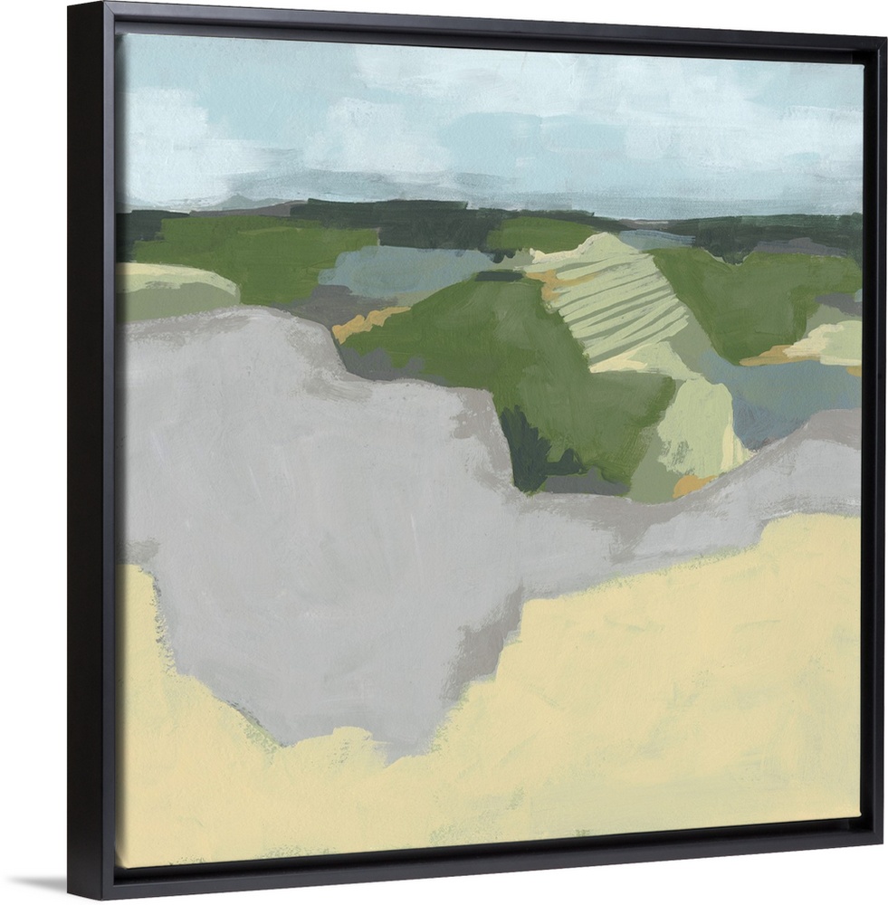 <p>Contemporary abstract landscape in green, brown, and gray with a light blue sky overhead.</p>