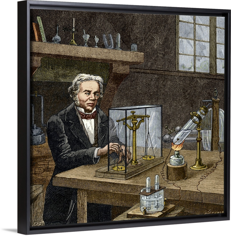 <p>Faraday's electrolysis experiment. Historical artwork of British chemist and physicist Michael Faraday (1791-1867) experimenting on electrolysis in 1833. The test tube (lower right) contains two platinum electrodes dipped in molten tin chloride heated by a spirit lamp. The electrodes are connected to a battery (not seen) and a voltmeter (bottom centre). The amount of hydrogen and oxygen gas produced in the voltmeter is a measure of the amount of electricity used. Chlorine is produced at the positive electrode (wire) and tin at the negative electrode (round coil). Weighing the coil showed that the amount of tin deposited was proportional to the amount of electricity. From Physique Populaire (E. Desbeaux, 1891).</p>