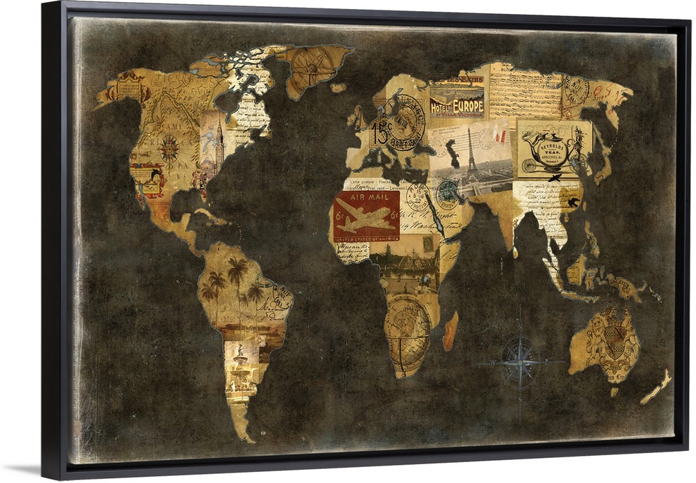 <p>Map of the world created with travel stickers and handwritten letters.</p>