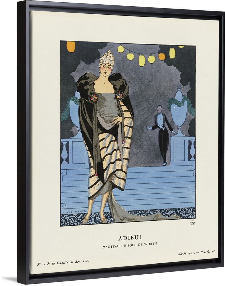 <p>Adieu! Farewell! Manteau du Soir, de Worth. Evening coat by Worth. Art-deco fashion illustration by French artist George Barbier, 1882-1932. The work was created for the Gazette du Bon Ton, a Parisian fashion magazine published between 1912-1915 and 1919-1925.</p>