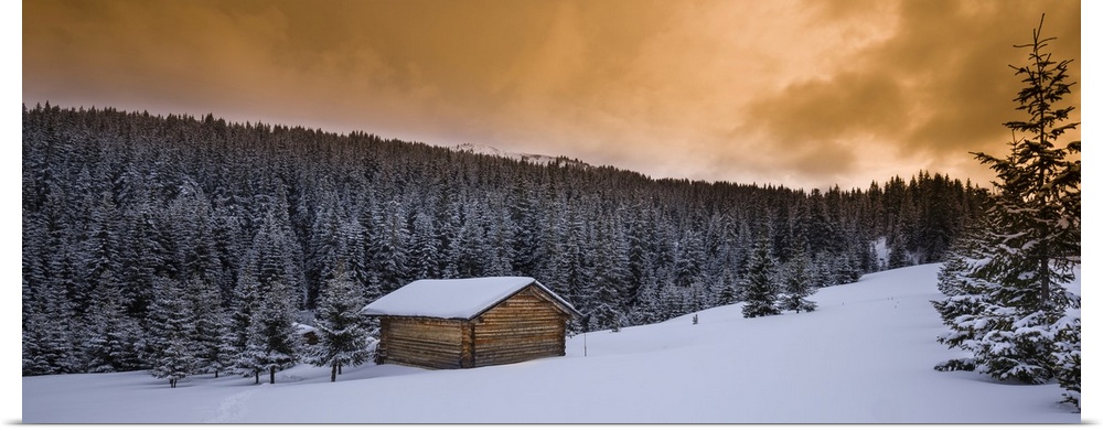 <p>Farm hut and forest in winter, dolomite mountains, Alta Badia, south Tyrol, Italy.</p>
