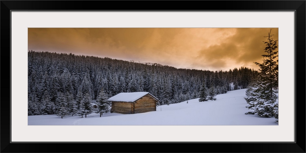 <p>Farm hut and forest in winter, dolomite mountains, Alta Badia, south Tyrol, Italy.</p>